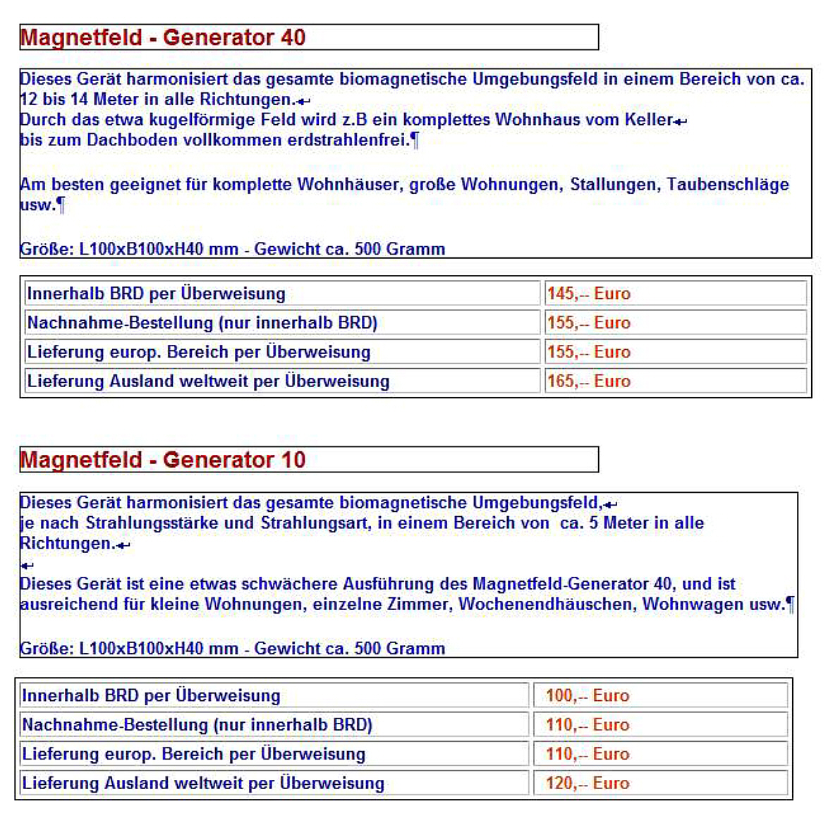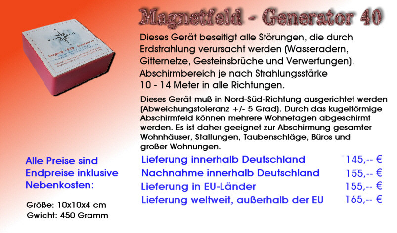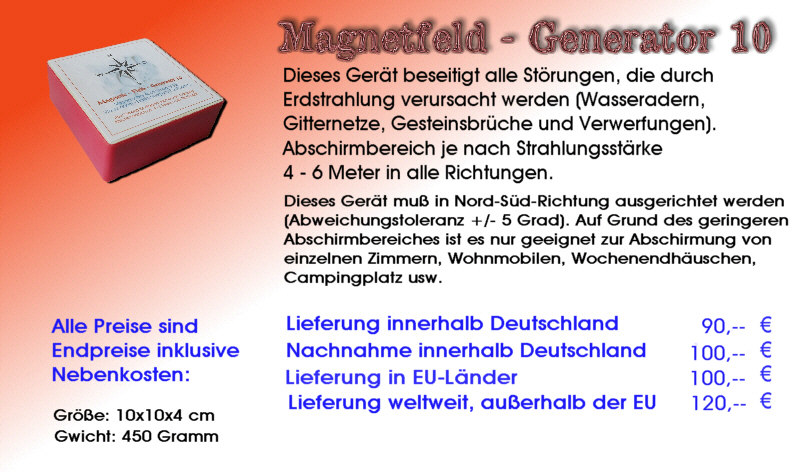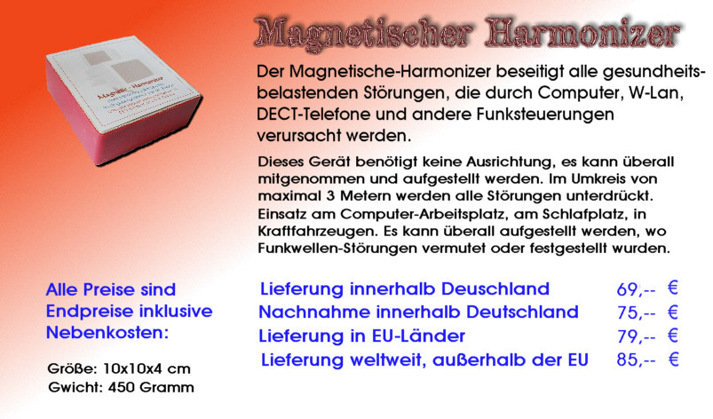 Umgebungsfeld wieder harmonisiert, alle gesundheitsbelastenden Strahlungseinflüsse werden beseitigt, es ist nur noch die normale Grundstrahung vorhanden. |